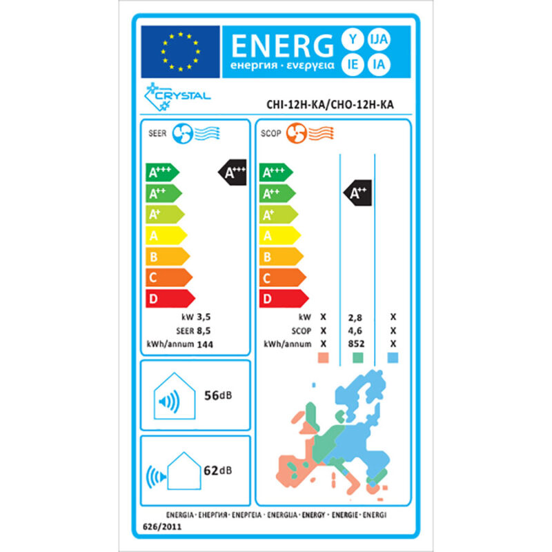 | Охлаждане | Мощност (мин. – макс.) W 2700 (800 – 3200) 3500 (1000 – 4000) 5200 (1500 – 6300) 7000 (1600 – 7800) Консумация (мин. – макс.) W 590 (170 – 1400) 890 (190 – 1500) 1295 (260 – 1800) 2000 (420 – 2760) Ток A 2.6 4.0 5.8 8.9 SEER / EER – 9 / 4.41 8.5 / 3.93 7.8 / 3.86 7.9 / 3.50 Енергиен клас Cool A+++ A+++ A++ A++ |